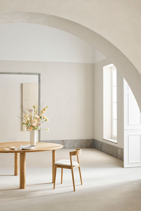שולחן האוכל Latch חוקר את היופי הפשוט של עץ אלון מלא, הכולל צורה אורגנית ועיצוב שמושך את העין.