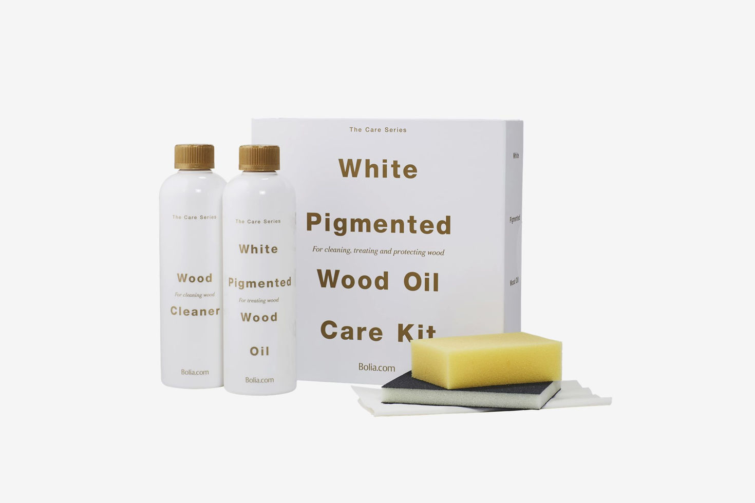 Bolia Wood Cleaner 384 ml.: Saponified Coconut Acid, Preservative Bolia Wood Oil 384 ml.: White Mineral Oil, Linseed Oil, Tung Oil, Titandioxid 1 sponge Lint-free cloth Sanding sponge