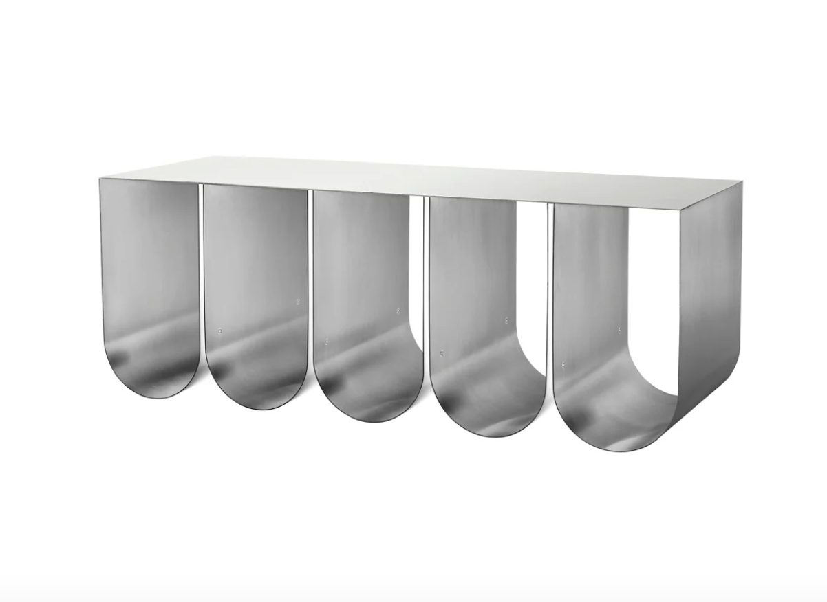 הספסל האייקוני של סטודיו Kristina Dam בגרסא חדשה- נירוסטה. הספסל עשוי מתכת מנימליסטית, וצורות הקשתות בבסיס הספסל יוצרות אלמנט עיצובי ופונקציונאלי שיהיה קשה להשאר אדישים אליו.