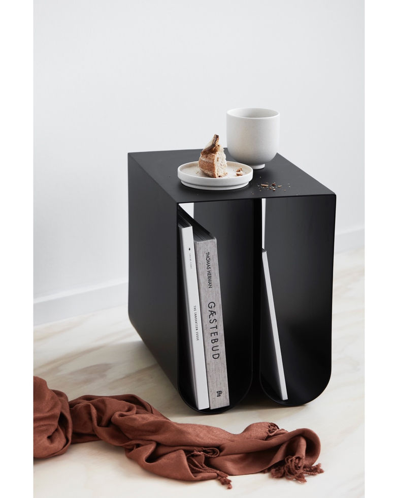 שולחן הצד החדש והפיסולי של סטודיו Kristina Dam. השולחן עשוי מתכת מנימליסטית צבועה או בגרסא של פלדת אל חלד. צורות הקשתות בבסיס השולחן יוצרות אלמנט עיצובי, פונקציונאלי ועכשווי .