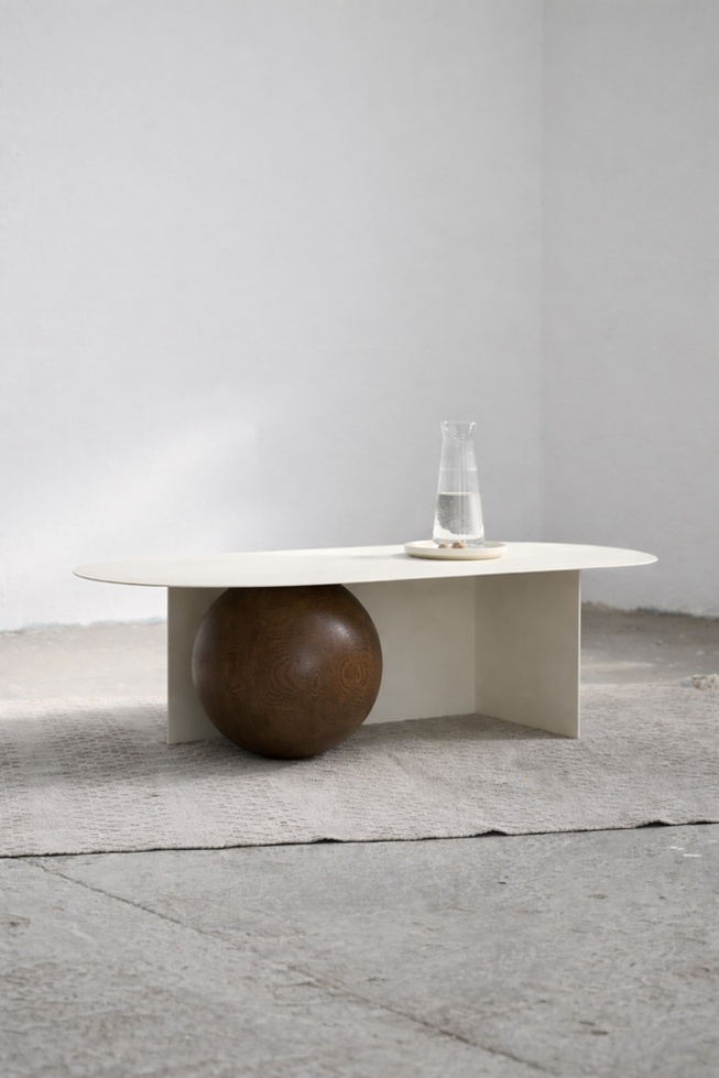 FUKU הוא שולחן קפה גיאומטרי ממתכת בגימור צבע איכותי ופרט של כדור עשוי עץ אורן מלא בעבודת יד.