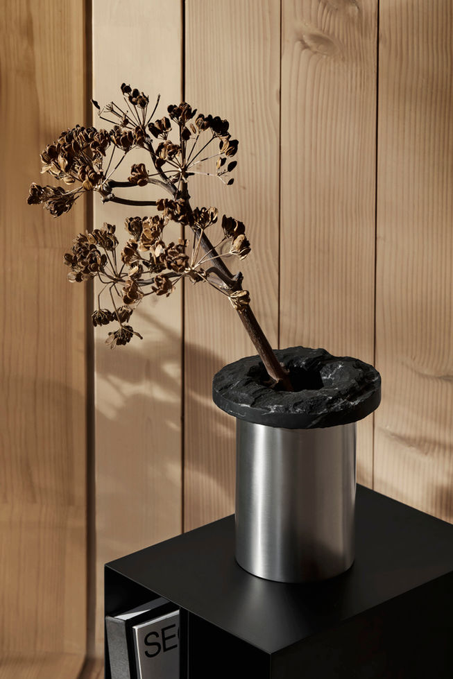 יחסי הגומלין הנועזים של בסיס נירוסטה מוברש בצורת גליל חלק עם היופי הגולמי והאורגני של פלטת שיש שחורה מחוספסת יוצר תחושה תמידית של איזון לצד מתח.