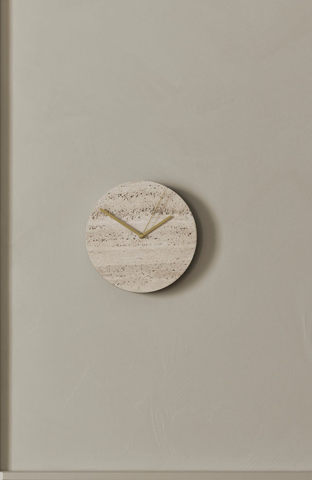 TIMA עשוי מחומרים טבעיים. שעון הקיר עשוי מסגרת מפורניר אלון ולוח שעון טרוורטין ייחודי עם פרטים מינימליסטיים בפליז. השעון מתוכנן להיות שקט לחלוטין, כך שאין צורך לדאוג לכל תקתוק מפריע.